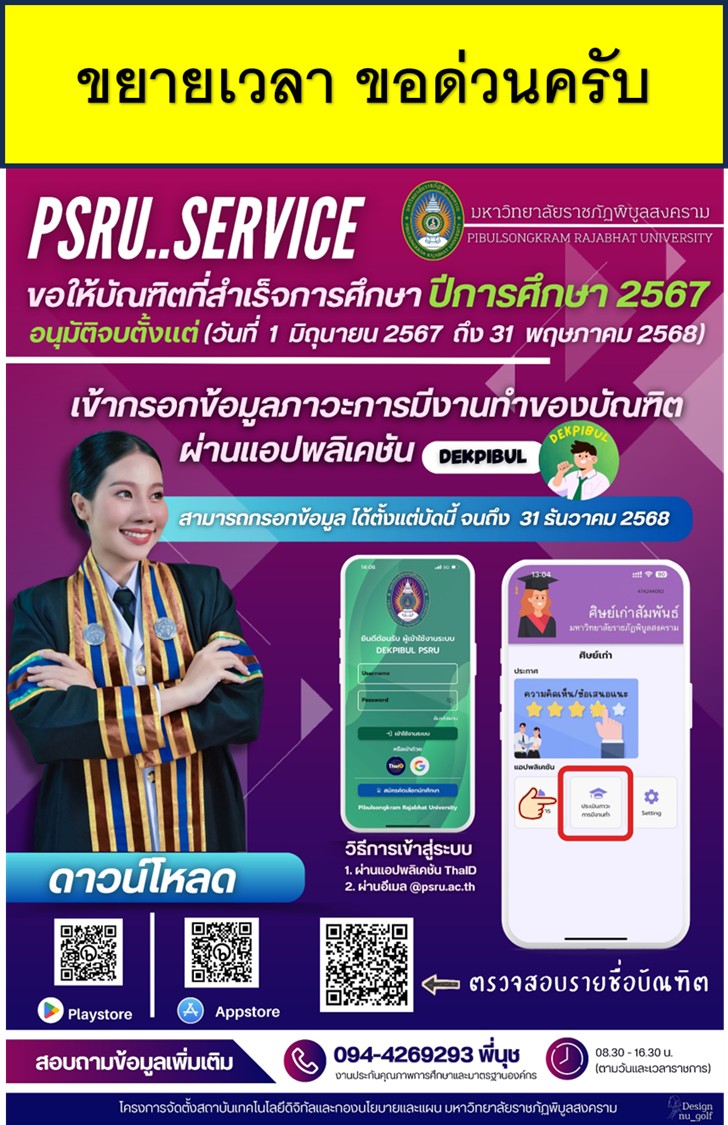 ติดต่อสอบถามรายละเอียดที่งานรับเข้า ทะเบียนและประมวลผลการศึกษา กองบริการการศึกษา มรพส. โทร. 0-5526-7050 หรือ 09-4960-2421 หรือ Line: @reg.psru