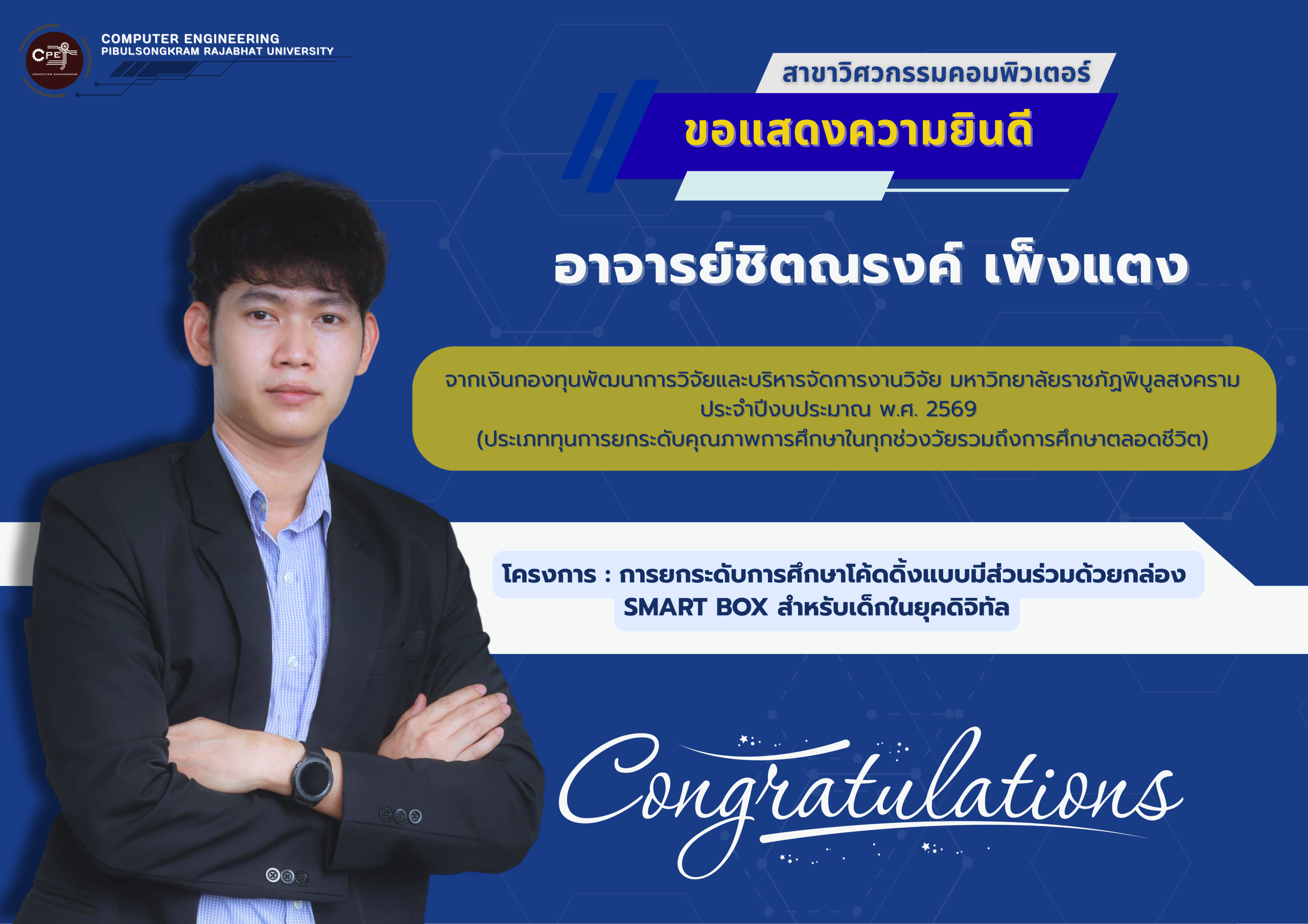 สาขาวิศวกรรมคอมพิวเตอร์ คณะเทคโนโลยีอุตสาหกรรม มหาวิทยาลัยราชภัฏพิบูลสงคราม ขอแสดงความชื่นชมและยินดีกับคณาจารย์ทั้ง 2 ท่าน ในโอกาสได้รับทุนสนับสนุนการวิจัย จากเงินกองทุนพัฒนาการวิจัยและบริหารจัดการงานวิจัย มหาวิทยาลัยราชภัฏพิบูลสงคราม ประจำปีงบประมาณ พ.ศ. 2569