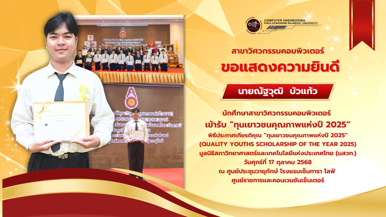 กิจกรรม/ความเคลื่อนไหวCPE นายวัชรพล เพ็งเทศ นักศึกษาสาขาวิชาวิศวกรรมคอมพิวเตอร์ ได้รับทุนเยาวชนคุณภาพแห่งปี 2023 (Quality Youths Scholarship of The Year 2023)ตุลาคม 25, 2023กุมภาพันธ์ 10, 2025